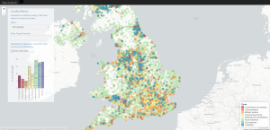 The demo version includes data on demography, house prices and concentration of eateries. It is an interactive tool that provides data at the national level and pop-up data at the postcode level across the UK. It has been developed for use on larger screens and for presenting snapshots to compliment wider location analytics projects.